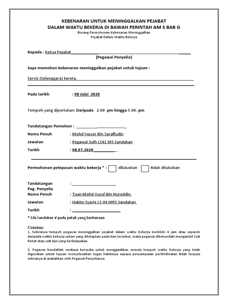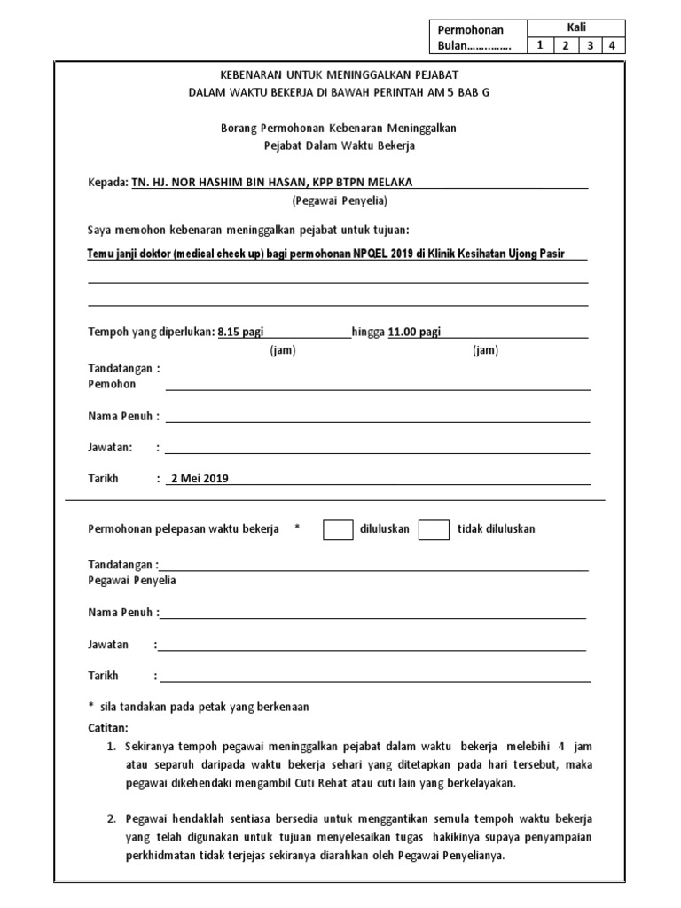 Sekiranya tempo h pegawai meninggalkan pejabat dalam waktu bekerja melebihi 4 jam atau separuh daripada waktu bekerja sehari yang ditetapkan pada hari tersebut maka pegawai dikehendaki mengambil cuti rehat atau cuti lain yang berkelayakan. For more information and source see on this link. Http Medicalprac Moh Gov My V2 Uploads Borang 20pelepasan 20keluar 20pejabat Pdf.
