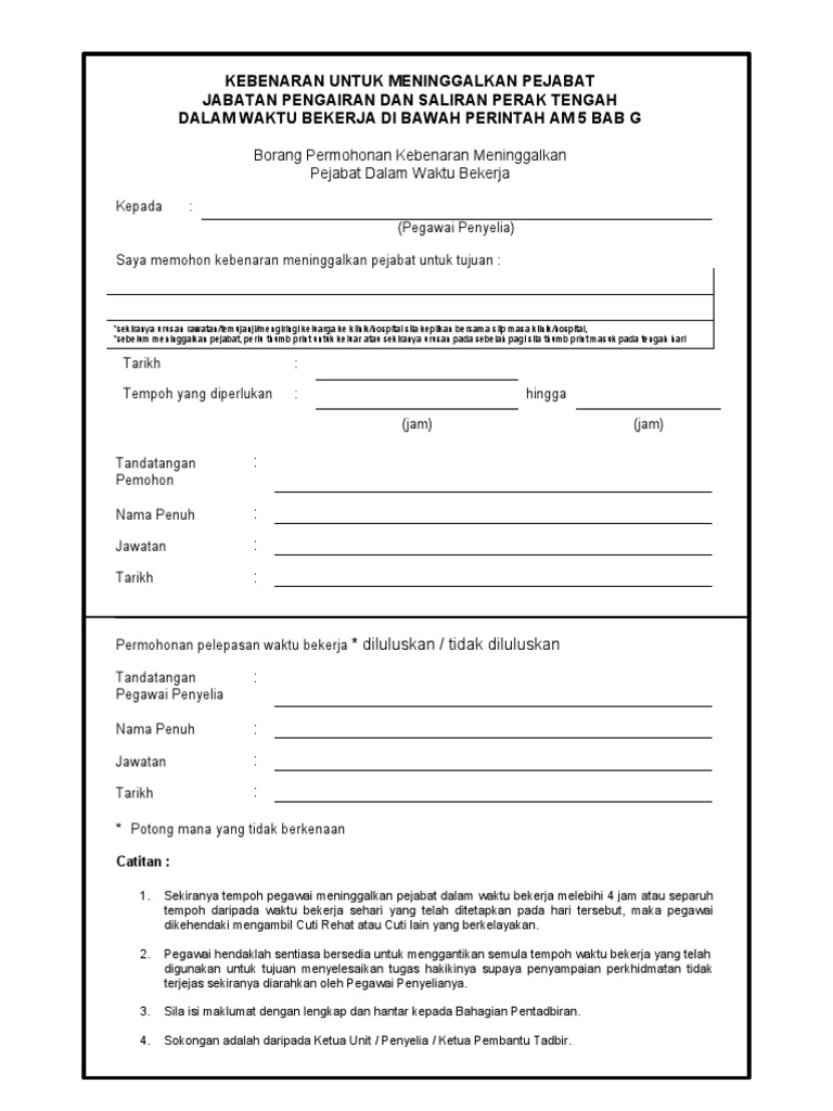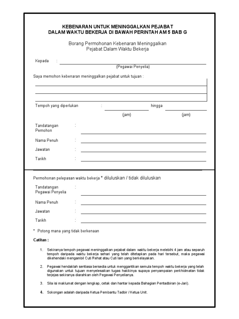 Borang permohonan kebenaran meninggalkan pejabat. For more information and source see on this link. Pegawai hendaklah sentiasa bersedia untuk menggantikan semula tempoh waktu bekerja.