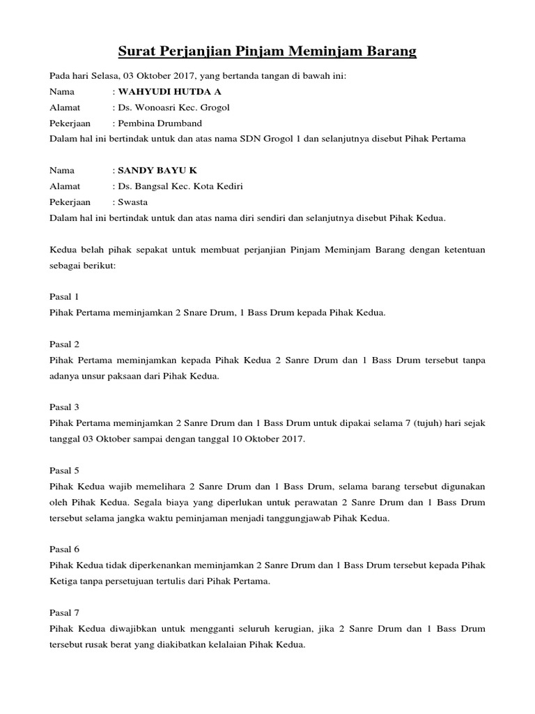 Contoh Surat Perjanjian Peminjaman Barang Doc