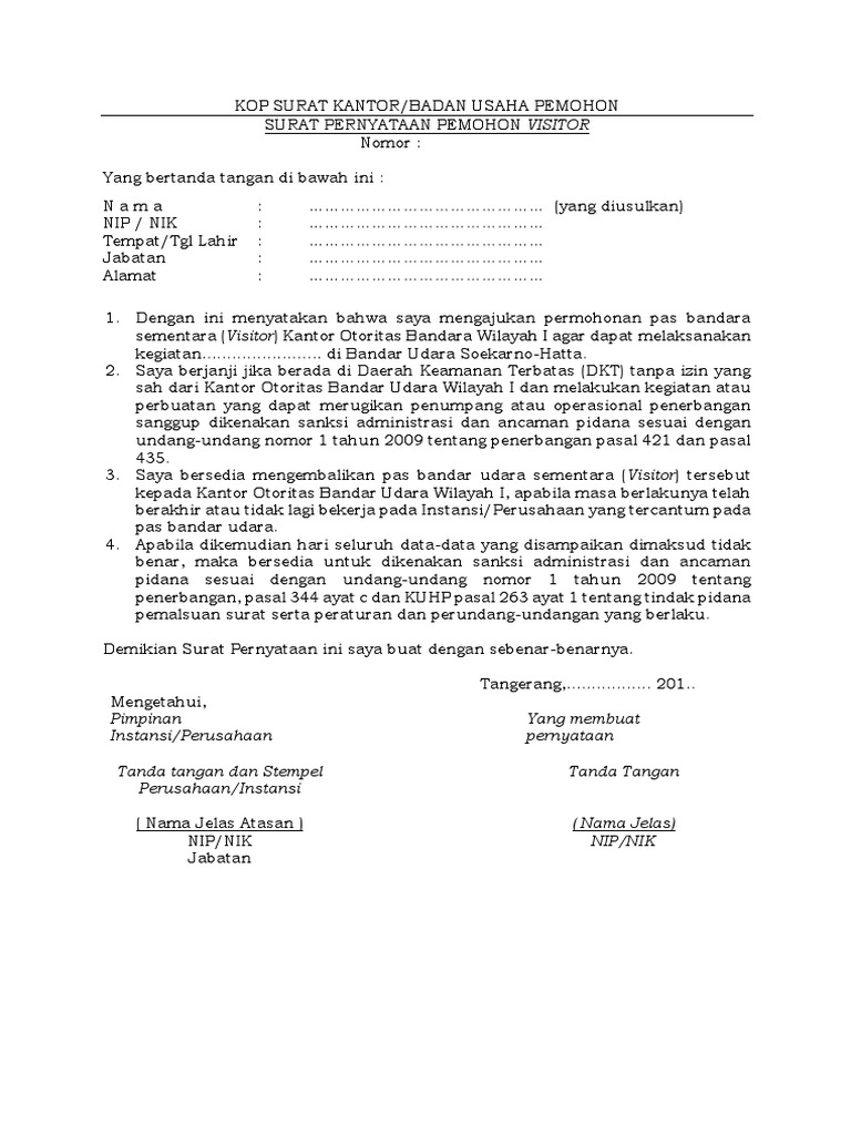 Format Surat Pernyataan Pemohon Pas Visitor 14883459471214format Surat Pernyataan Pemoho