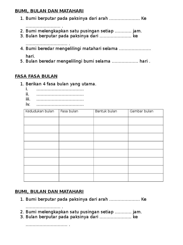 Soalan Sains Tahun 5 Bumi Bulan Dan Matahari Kosong Kerja