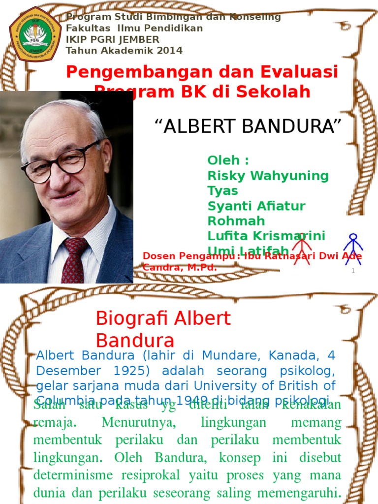 TEORI SOSIAL KOGNITIF BANDURA Biografi Albert Bandura Tokoh ini dilahirkan pada tahun 1925 di Alberta Canada. Bandura memandang tingkah laku manusia bukan sematamata reflex atas stimulus S-R bond melainkan juga akibat reaksi yang timbul akibat interaksi antara lingkungan dengan kognitif. Vasta Ed Annals of child developmentVol.