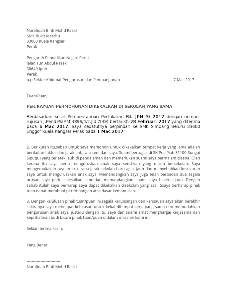 Contoh Surat Rayuan Pertukaran Egtukar Dantia Spa